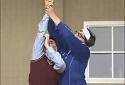 on the ropes = 줄에 기대서 간신히 버티는 상황일때