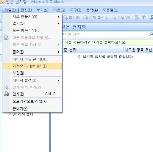 아웃룩을 실행한 후 메뉴에서 '파일'을 선택합니다.