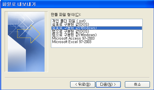 '쉽표로 구분된 값(Windows)'를 선택한 후 '다음'버튼을 누릅니다.